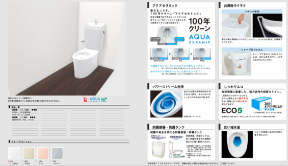 ・超節水型便器で、『フチ』が無いので今までの様なフチ裏のこびりつき汚れがありません! ・『アクアセラミック』コーティングでいつまでもキレイ! ・本体操作式温水洗浄便座付き!