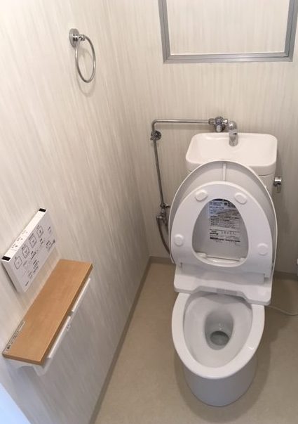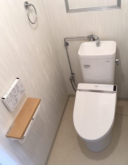 ポイント①:こちら様のトイレは元々昔ながらの『タンク隅付き型』便器だったので、『タンク密結型』便器へのご提案からとなりました。もちろん、今までのイメージを一新、トイレ内の壁紙や床のクッションフロアも張替です!