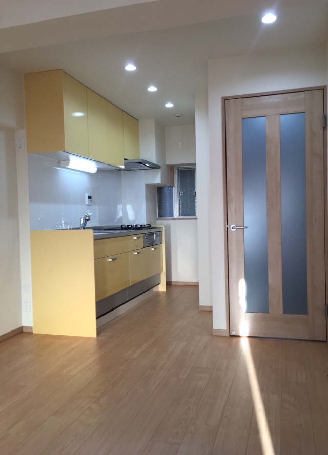 ポイント②:システムキッチンはあか抜けたイエローを採用。意外と良いんです!各部屋の建具類をすべて入れ替えて古めかしさを解消。壁紙はもちろん、今やスタンダードの幅広タイプフローリングに張替で、今どきの仕上がりに!