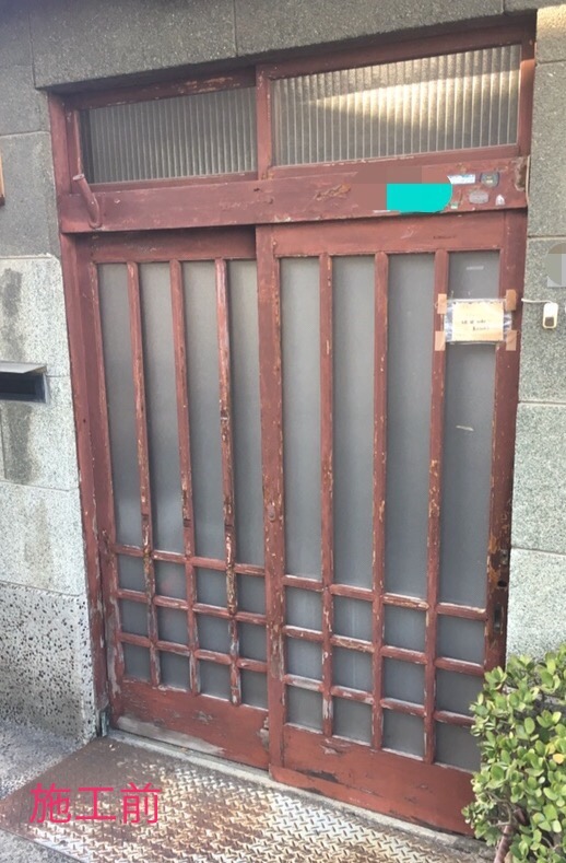 ポイント①:こちらの物件様は、なんと築80年超の建物で、玄関の木製引き違い戸が立て付けが悪く開閉がしずらい状態でした。